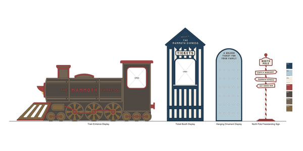This listing is for (4) Utah Mammoth Holiday Party display components (Train Entrance Display - Not Shown, Ticket Booth Display, Hanging Ornament Display + North Pole Freestanding Sign). Customer has supplied initial sizing and material finish preferences. Gray Skunk Inc. is to provide digital design services to aide in the development and production of a custom piece. Should excessive time be needed to complete the project, additional fees may be required.